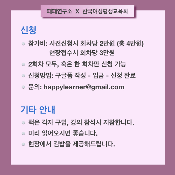 출간 후 북토크를 제외하면 최초로 하는 특강입니다. 2회차에 걸쳐 책 한 권을 함께 읽어갑니다. 책의 내용을 구체적으로 짚어가며 내용 정리하는 식으로 강의할 예정입니다. 혼자 읽기 어려우셨던 분, 가이드가 필요하신 분, 관심 있으신 분 등등 많이 신청해주세요. 궁금한 점 있으시면 happylearner@gmail.com 으로 문의 주세요.