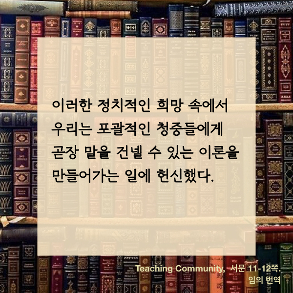벨 훅스가 왜 '모두를 위한 페미니즘'같은 책을 썼는지 알 수 있는, '가르침의 공동체'에 나온 구절. 평범한 사람들의 삶에서도 혁명적인 변화가 일어나도록 하는 것.