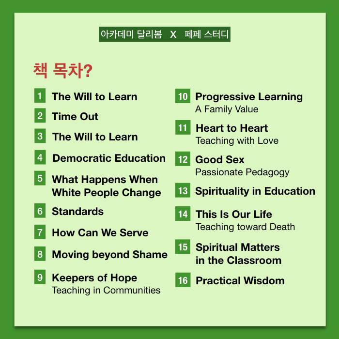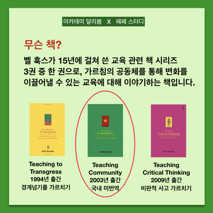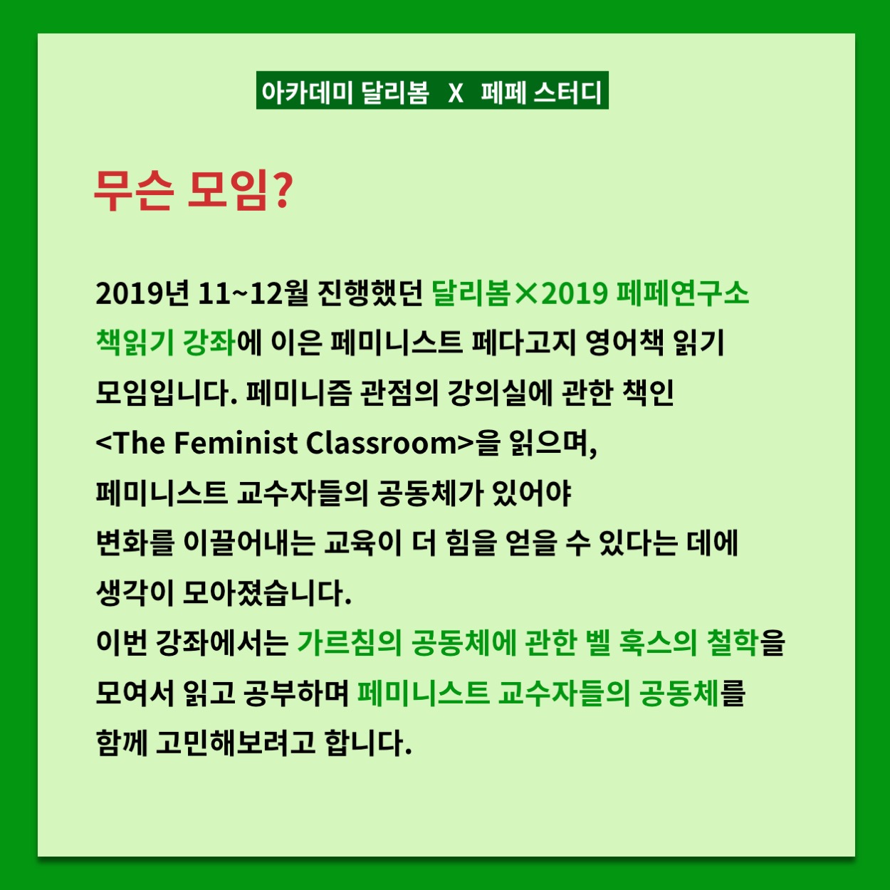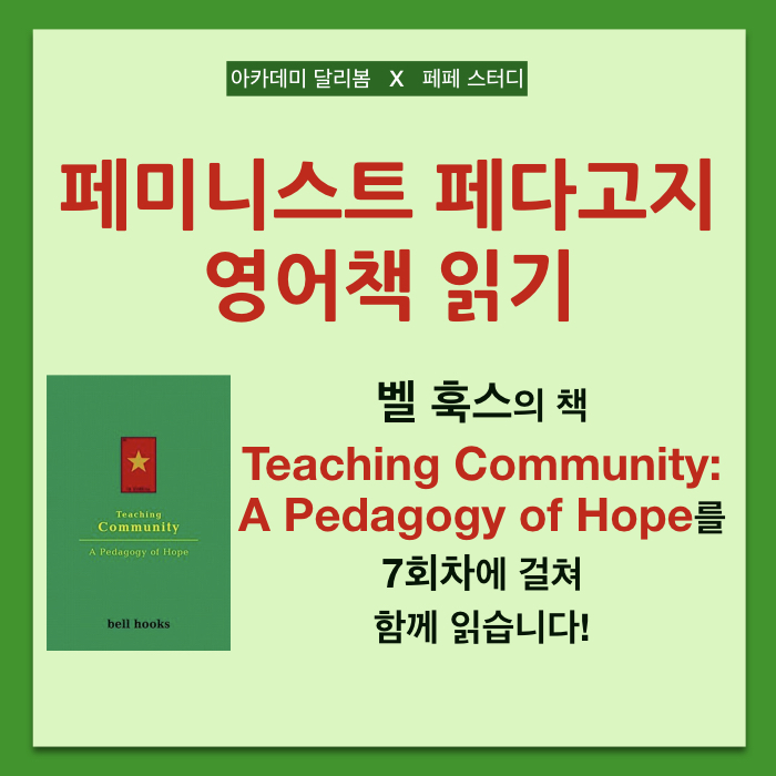 감사하게도 페미니즘 서점 '달리,봄'과 계속 협업하게 되었습니다. 작년에 달리,봄에서 'The Feminist Classroom'을 읽었던 '2019 페페연구소 책읽기 강좌'가 올해에는 페미니스트 페다고지를 공부하는 모임이라는 뜻으로 '페페 스터디'라는 이름으로 이어가려고 합니다. 벨 훅스의 교육 관련 시리즈 3권의 책 중 국내에 번역되지 않은 유일한 책, Teaching Community를 7주간 함께 읽습니다. 작년 모임에 이어 이번에도 "서로의 불확실성으로부터 배우는" 소중한 시간이 되기를 소망합니다. 많은 관심 부탁드려요~!
