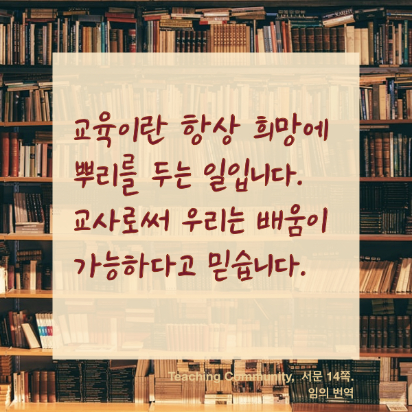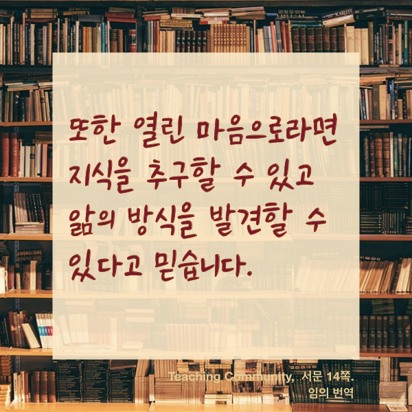 교육이란 항상 희망에 뿌리를 두는 일이다. 벨 훅스가 말하는 교육이란 "열린 마음"에서 시작되어 모든 것이 가능해지는 그런 교육이다. 오늘의 키워드. 열.린.마.음.