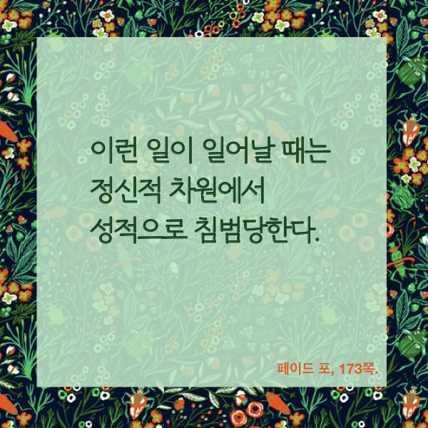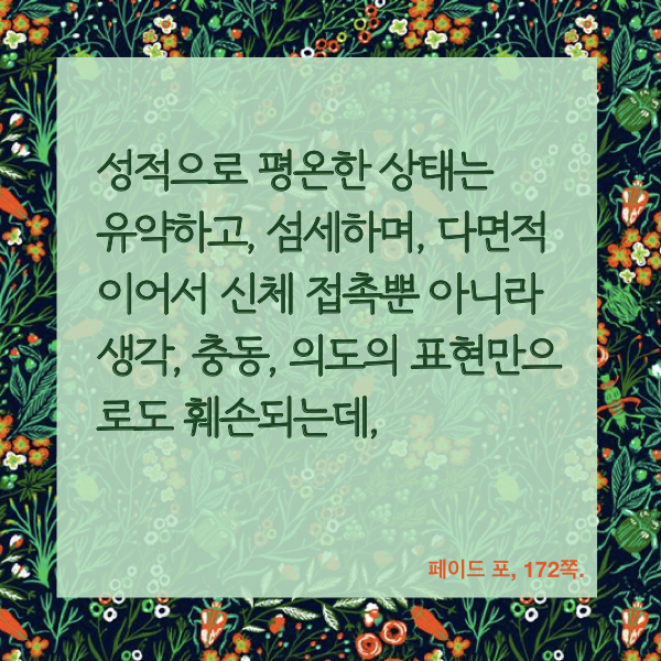 성적 평온함의 상태란 그리도 유약한 것이어서, 아주 쉽게 아주 쉬운 몸짓 눈짓 말 한 마디 뉘앙스 등으로도 훼손된다. 도저히 상상할 수도 없지만, 성에 대해 조금만 생각해봄으로써 성매매 여성들이 매일매일 경험하는 성폭력의 쓰나미를 아주 조금이라도 이해할 수 있기를.