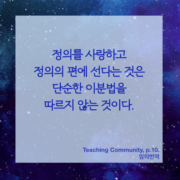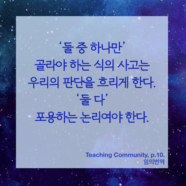 꼭 학문적인 일이 아니어도, 모든 일을 이분법적으로 바라볼 때가 얼마나 많은지. 가르치는 사람들의 마인드에 그 이분법이 장착되어 있다면 예를 들어 학생들을 공부 잘 하는 학생과 못 하는 학생, 열심히 하는 학생과 안 하는 학생으로 나누기 쉽다. 물론 이분법적으로 (either/or) 양자택일해야할 상황도 삶에 존재하겠지만, 벨 훅스에 따르면, "정의의 편에 선다는 것"은 모든 것을 이분법으로 나누는 것이 아니라, 둘 다(both/and) 가능하다는 관점으로 포용하려는 자세를 의미한다. 배우고자 하는 의지, The WIll to Learn, 1장이다.