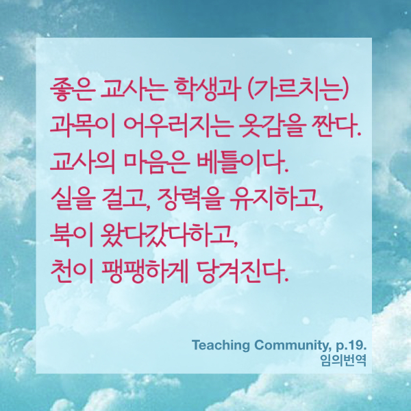 교사와 학생과 가르치는 과목/주제가 한데 어우러져서 짜여 들어가 하나의 천을 만든다는 비유. 마음에 든다. 그 과정에서 교사의 마음(heart)이 늘 열려있어야 하지만, 그렇기에 또 상처받을 수도 있다는 말도. 가르치는 일을 좋아할수록 더 상처받기도 쉽다는 말도. 가르치는 현장에서 상처받아왔을 모든 사람들이 이 책을 읽고 위로받고 힘을 얻으면 좋겠다.