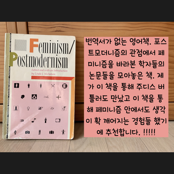 3. Feminism/Postmodernism: 번역서가 없어서.. 영어책입니다. 포스트모더니즘의 관점에서 페미니즘을 바라본 학자들의 논문들을 모아놓은 책. 제가 이 책을 통해 주디스 버틀러도 만났고 이 책을 통해 페미니즘 안에서도 생각이 확 깨어지는 경험들 했기에 추천합니다.