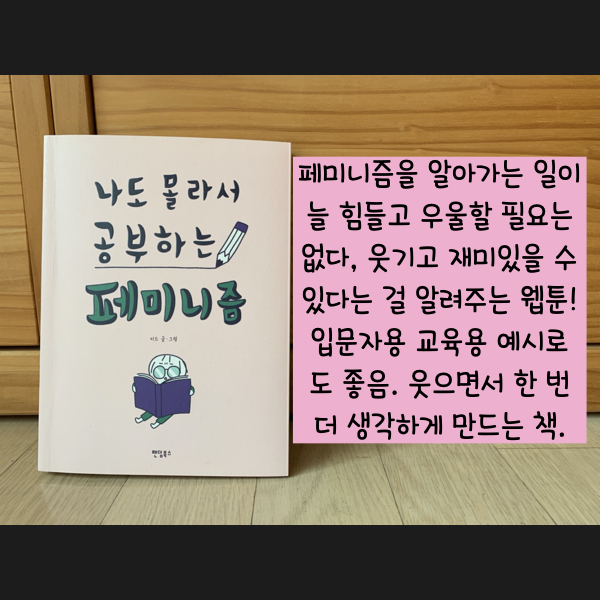 1. 나도 몰라서 공부하는 페미니즘 : 페미니즘을 알아가는 일이 힘들거나 우울하지만은 않을 수 있음을 알려주는 책입니다. 더불어 입문자들 교육용 예시로 쓰기에도 좋습니다. 웃기고 재밌으면서도 생각할 수 있게 해주는 페미니즘 입문 웹툰!