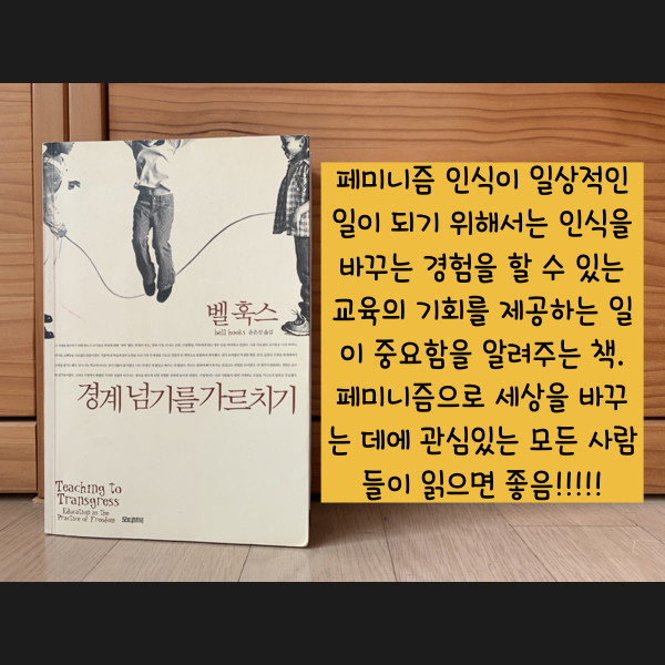2. 경계넘기를 가르치기: 페미니즘 인식이 일상이 되기 위해서는 인식을 바꾸는 경험을 하게 하는 배움의 기회를 제공해야 합니다. 두말할 것도 없는 벨 훅스의 책. 페미니즘으로 세상을 바꾸는 데 관심있는 모든 사람들이 읽으면 좋습니다!