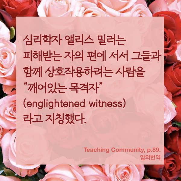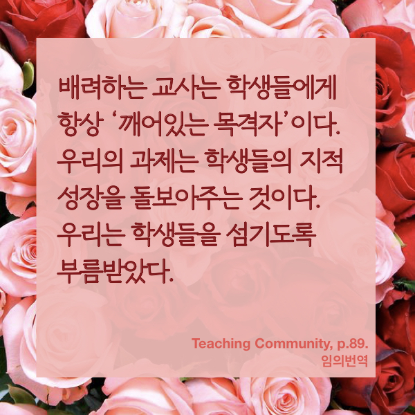 학습자들의 지적 정서적 성장을 돕는 것이 교수자의 임무다. 우리는 학생들을 섬기기 위해 부름받았다. '깨어있는 목격자'가 된다는 것의 의미를 구체적 가르침의 현장에서 고민해보아야겠다.