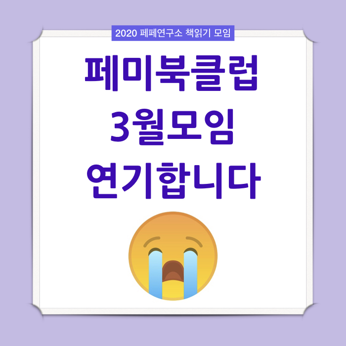 3월 12일 예정이었던 페미북클럽 모임은 코로나바이러스로 인한 사회적 거리두기에 동참하는 의미에서 일단 4월 말로 연기했습니다. 개별연락 드렸습니다. 모두들 건강하시길!