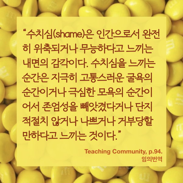 학교에서 혹은 누군가 사람들이 있는 공적인 영역에서 공개적으로 창피를 당한 경험. 혹은 그렇게 직접적이 아니더라도, 벨 훅스 책의 이 챕터에서 설명하는 것처럼, 미묘하고 정교하게 어릴 때부터 우리의 마음 속에 심어진 수치심. 그리고 그로 인해 영향받은 자아개념을 갖고 있는 학생들이 교육의 장면에 들어와 있을 때 교수자가 어떻게 해야 하는가. 수치심, 그리고 수치심을 심어준다는, 생각도 못했던 개념을 이번 챕터에서 또 새로이 발견한다.