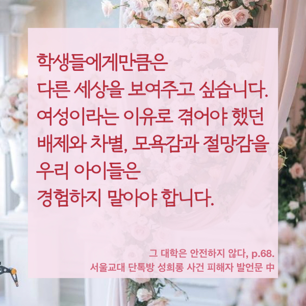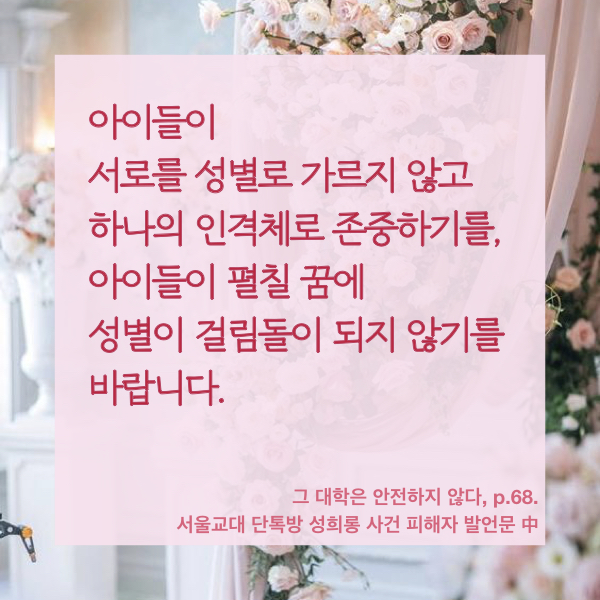 서울교대 국어교육과 졸업생 및 재학생 성평등 공동위원회를 응원합니다. 그대들이 바꿀 교육의 현장을 기대합니다. 이 부분을 읽으며 눈물이 났습니다. 그대들의 눈물에 비할바는 아니지만, 나 또한 이 주옥같은 선언이 성희롱 사건 피해자들의 발언문임을 기억하겠습니다.