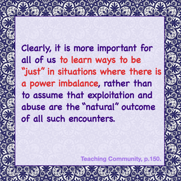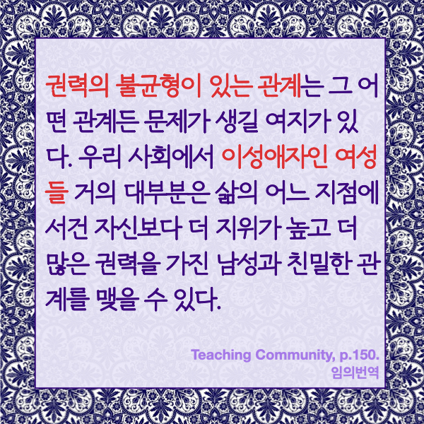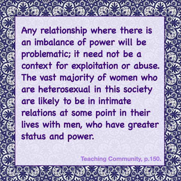 어떤 관계든 마찬가지지만, 특히 이 사회에서 이성애자 여성들이 자기보다 나이가 많고 사회적 지위가 높고 권력을 더 많이 가진 남성과 데이트하거나 결혼할 때. 비록 상대가 이 자본주의적 가부장제 사회에서 나보다 모든 사회경제적 권력이 더 높다 해도, 그것이 상대가 나를 학대하거나 착취하는 것의 정당화로 연결되어서는 안된다. 경계를 짓기가 매우 애매하지만.