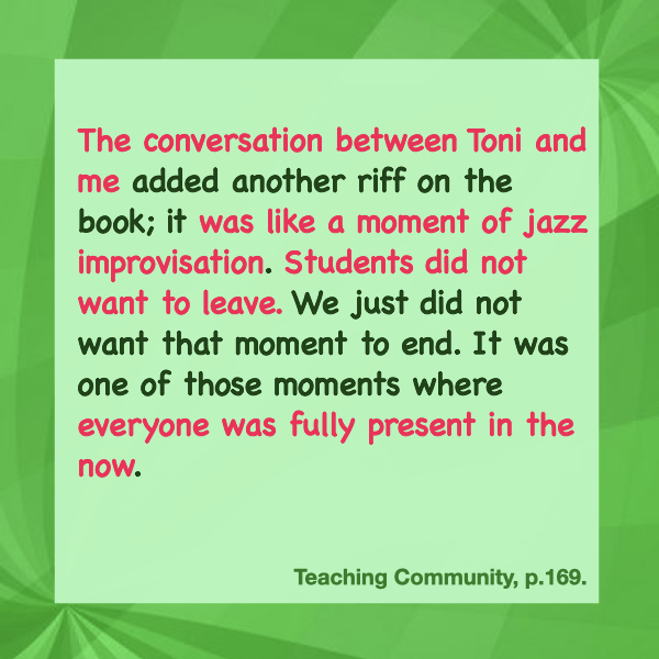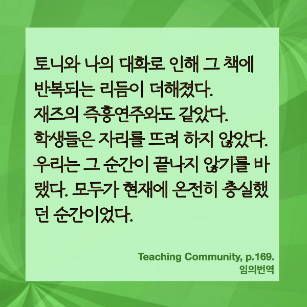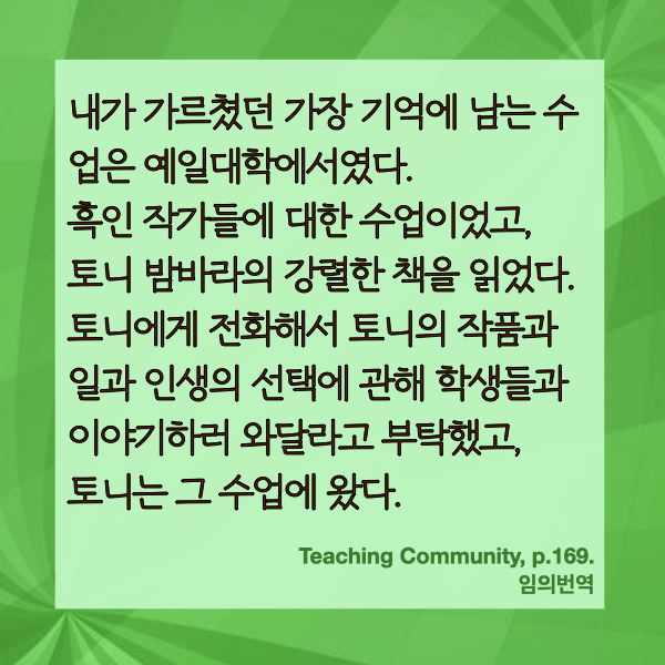 마치 재즈의 즉흥연주와 같았다. 학생들이 자리를 뜨려 하지 않았고, 우리 모두 그 순간이 끝나지 않기를 바랬다는 구절이 나에게는 강렬하게 와닿는다. 내가 가르치는 수업에서 학생들과 함께 읽는 책의 저자를 초대해서 그와 함께 대화하고, 그로 인해 학생들과 그 자리에 있던 모두가 현재에 온전히 충실해지는 경험을 할 수 있다면 좋겠다. 그런데 그러기에는 내 수업이 모두 서구 학자들의 이론으로 구성되어 있다. ㅠㅠ
