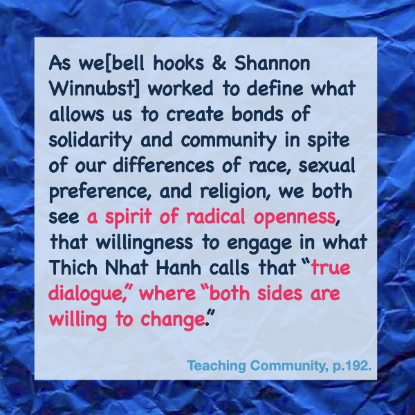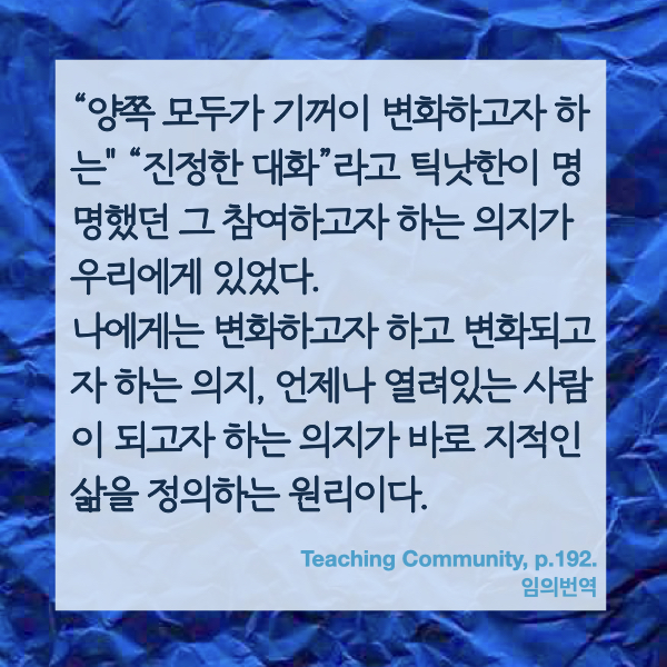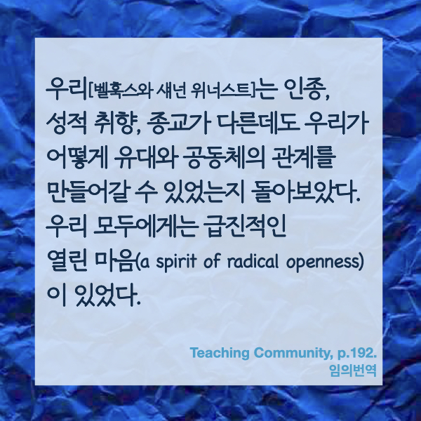 열린 마음이 급진적인 것이어야 하는가.. 벨 훅스의 책은 아주 기본적인 이야기를 하고 있는데, 때로는 그 기본이 급진적이어야만 할 수 있는 기본이기도 하다. 인종, 성적 지향성, 종교, 등등과 상관없이, 양쪽이 진정으로 대화하고자 하는 열린 마음이 있다면 친구가 될 수 있다. 음.. 나에게는 그런 친구가 있는지 돌아보게 된다.