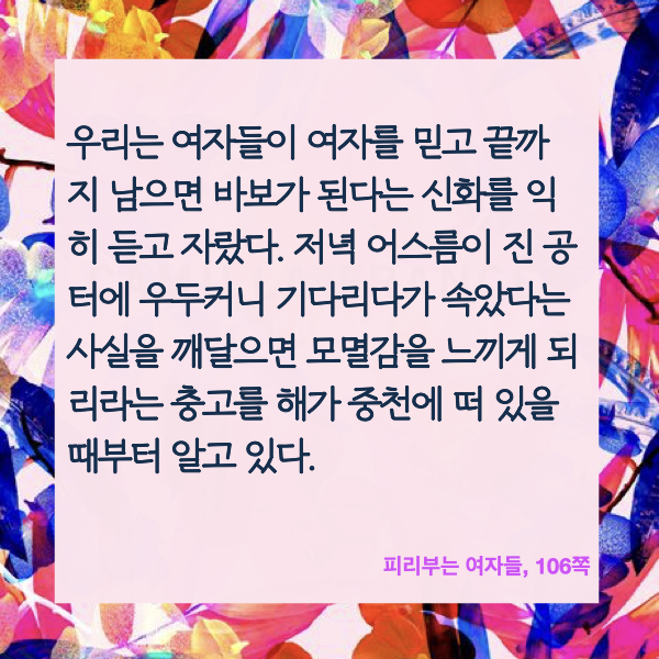 그러게. 우리 여자들은 여자의 적은 여자라는 말을 너무도 많이 듣고 자랐다. 내가 인간적인 호감을 느끼는 상대가 남자면 온 세상이 환영하고 지지해주지만 그 상대가 여자일 경우는 어떻게 해야 할지도 모르는 세상에서 자랐다. 그런 세상의 한복판을 관통하는 이민경의 글에는 깊은 울림이 있다.