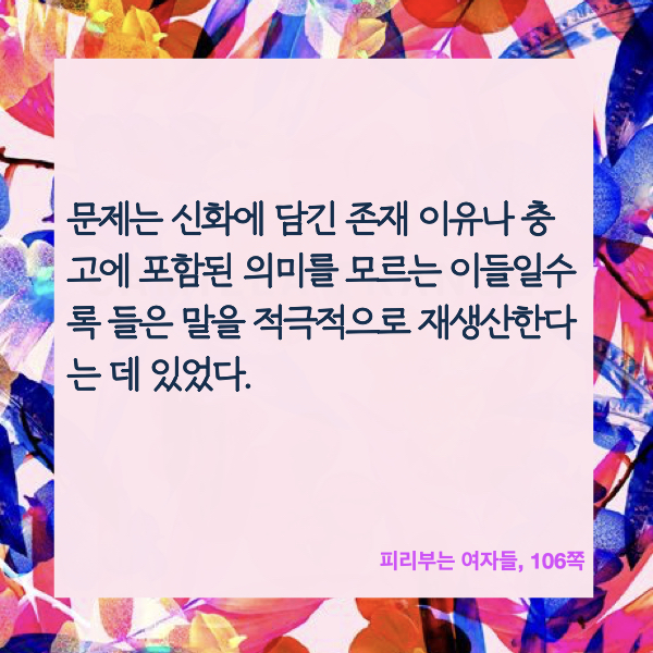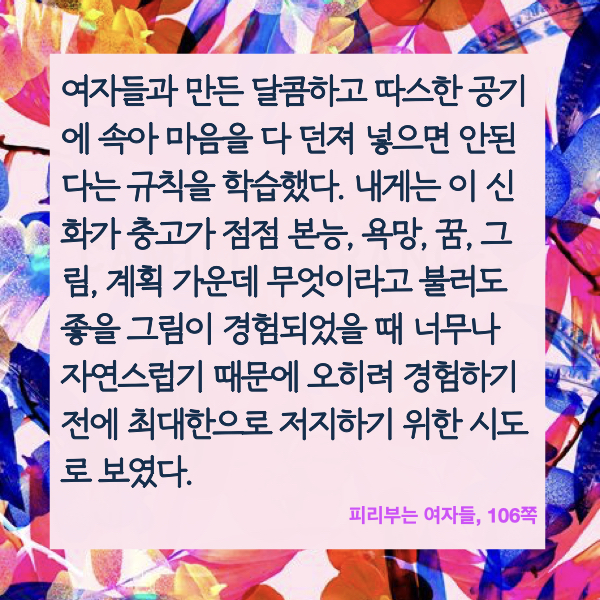 세 개의 글로 이루어져 있는 '피리부는 여자들'의 세번째이자 마지막 글인 이민경작가의 글이다. 유영하는 글이다. 물 이야기를 묘사해서 그런 것이 아니다. 구체적이었던 앞의 두 글과는 달리 이민경작가의 글은 구체적으로 말하지 않았음에도 무엇인지 알 수 있는 글이다. 문학적이다.