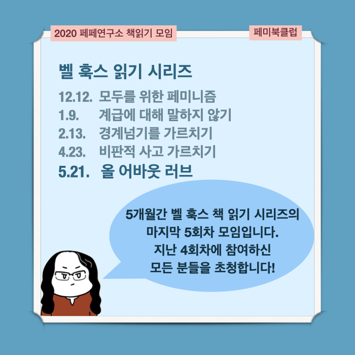 5개월 동안 한 달에 한 권씩 벨 훅스 책 읽기 5회차 시리즈의 마지막 모임을 5월에 합니다. 이번 모임은 시리즈의 마지막이라, 지난 4회차동안 참여하셨던 분들에게 초대장을 보내 사전신청을 받았습니다. 벨 훅스의 인품의 결정체인 '올 어바웃 러브'를 읽고 이야기나누는 마지막 시간 기대하고 있습니다.