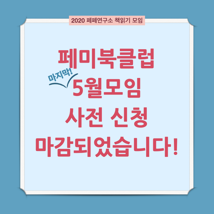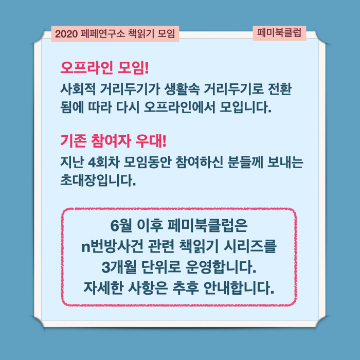 6월부터는 3회차 시리즈로, n번방 관련 새로운 읽기 시리즈를 기획 중입니다. 5월 모임 이후에 공지 올리겠습니다. 함께 읽고 함께 이야기하며 힘을 나누어가는 모임인 페미북클럽에 많은 관심과 참여 부탁 드립니다.