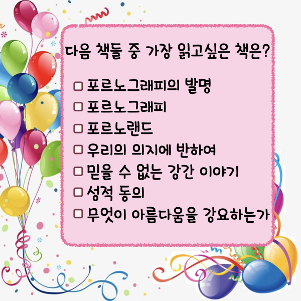 설문은 페미북클럽의 다음 시리즈인 n번방 사태 관련 책읽기 시리즈에서 기획중인 책들입니다. 가장 읽고 싶은 책을 1권 써 주시면 됩니다. 책 정보는 아래에 링크 합니다.