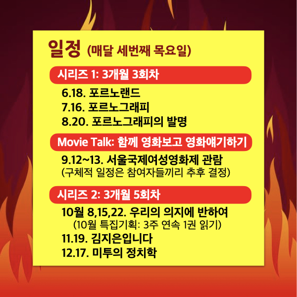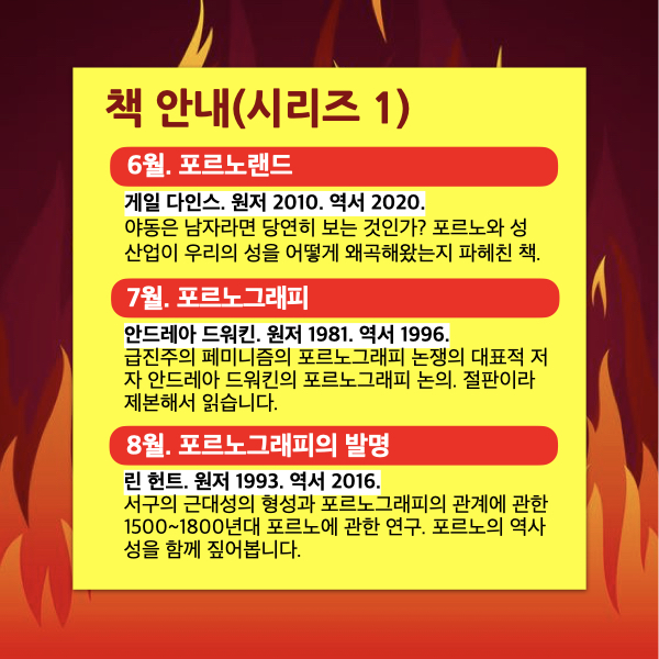 n번방 사건은 사실상 그 이전 아주 오래 전부터 존재해온 강간문화와 여성혐오문화에 뿌리박고 있다는 문제의식 아래, 페미북클럽 기획팀은 시리즈 1에 포르노 관련 책을, 시리즈 2에도 강간과 성폭력 관련 책을 읽기로 기획했습니다. 또한 억압적인 현실을 공부하기만 해서 우울해지지 않기 위해, 함께 실천을 위한 노력을 할 수 있는 기회들도 마련했습니다. 홍보물 읽어주시고 궁금한 점은 happylearner@gmail.com 으로 연락주세요. 책을 읽고 영화도 보고 이 사회의 강간문화에 대해 집중해서 생각하며 실천을 위한 한 걸음을 딛는 일에 관심있는 분들이 함께 하면 좋겠습니다. 많은 관심과 공유 부탁드립니다.