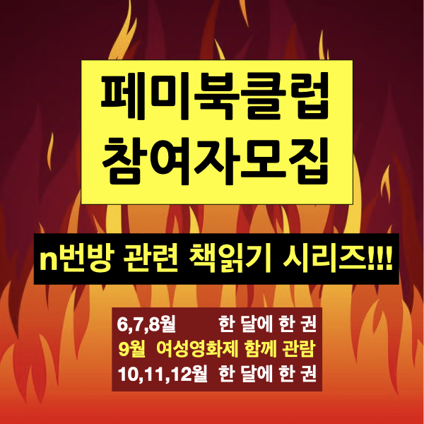페미북클럽이 지난 5개월간의 벨 훅스 책읽기 시리즈를 마감하고, n번방 관련 책읽기 시리즈를 새로이 오픈합니다. 아래와 같이 3번에 걸쳐 시리즈를 신청받습니다. 현재는 시리즈 1을 신청받고 있습니다.