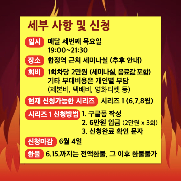 정원 8명이 다 채워져서 모임이 하루만에 마감되었습니다. 날짜를 매달 4번째 목요일로 옮겨 모임을 신설하려고 합니다. 다음번 게시물에서 확인해주세요! 감사합니다!!