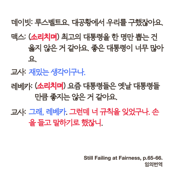 원래 이 반의 규칙은 발표할 때 손을 들고 선생님이 호명하면 말을 하는 것이었다. 그래서 초반에 켈빈이 손을 들지 않고 그냥 말한 스티븐에게 아무 일이 일어나지 않은 것을 보고 자기도 손을 들지 않고 앉아서 소리친 것이다. 스티븐, 켈빈, 데이빗, 맥스, 4명의 남아가 소리치며 말하도록 내버려두다가, 여아인 레베카도 소리치며 말하자 갑자기 우리 학급의 규칙이 생각났던 걸까, 교사는. 레베카에게는 okay라고만 하는 데 그치지 않고, 앞에 4명의 남자아이를 놔두고 여자아이인 레베카에게 갑자기 손을 들고 발표해야 하는 학급 규칙을 상기시킨다.