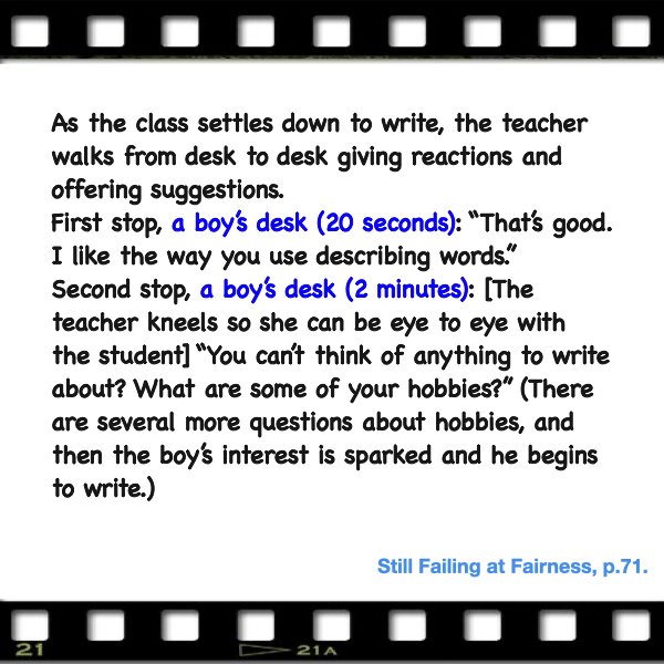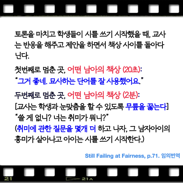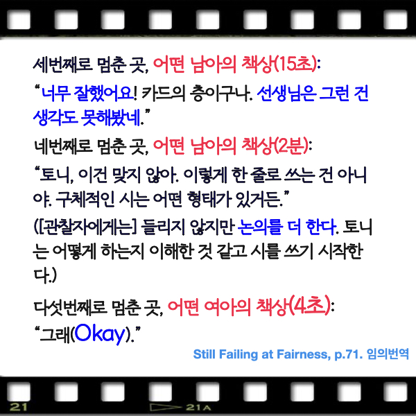 이 사례는 이 행동이 바로 앞에서 성평등한 관점의 시 쓰기 수업을 진행했던 교사의 무의식적 행동이라는 점에서 더 놀랍기도 하고 더 희망적이기도 하다. 적어도 이 교사는 자신의 모습이 녹화된 비디오를 보고 나서 자신의 무의식적 행동을 더 빨리 인식하고 더 잘 고치도록 하지 않았을까.