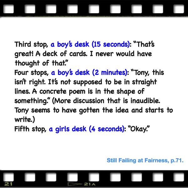 아까 그 교사, 인형은 멍청하다고 하는 남자아이의 말에 대응하여 성평등한 관점을 교실 안에 심어준 바로 그 교사가, 무의식적인 행동으로는 이렇게 하고 있었다. 의도한 것은 아니었겠지만, 교실을 돌아다니는 동안 남자아이의 책상에 4번 머무르며 피드백을 하는 동안 여자아이의 책상에는 1번 머무른다. 남자아이의 책상에서는 15초에서 2분까지 길게 머무르며 자세한 피드백을 해주면서 여자아이에게는 4초동안 눈길을 주고, 'okay' 피드백이 끝이다. 'good'도 아니다. 그저 'okay'다. 여자아이 입장에서는 그래서 내 시가 좋다는 건지 어떻다는 건지 알 수가 없는 그런 모호한 피드백이다.