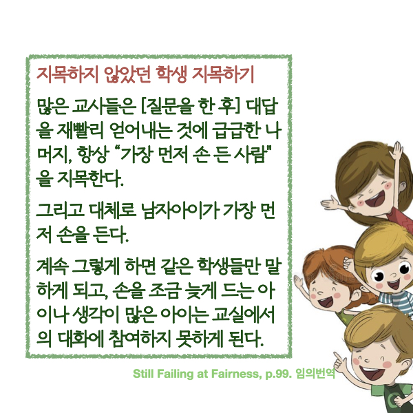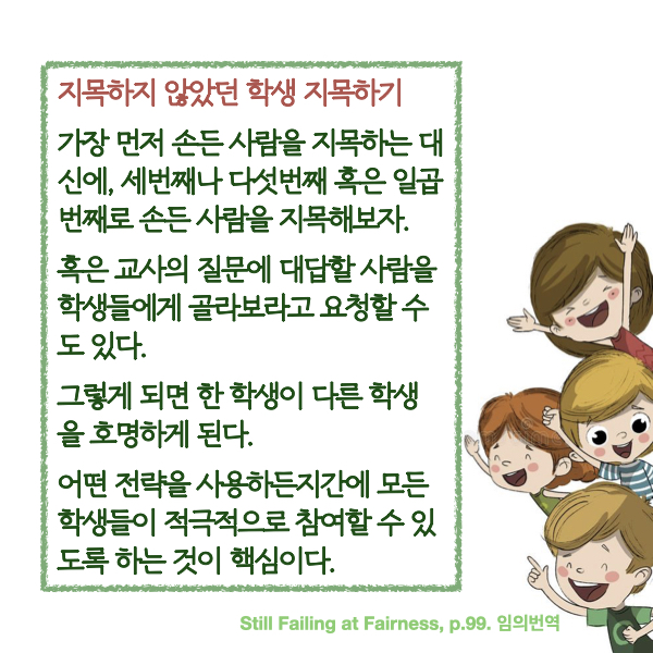 물론 내 수업이 잘 돌아가기를 원하고, 빈틈없이 말들이 빨리빨리 이어져야 잘 가르치는 것 처럼 보이는 기분을 느끼겠으나, 그런 모든 유혹을 뒤로 하고, 항상 '가장 먼저 손 든 사람' 대신 늦게 손든 사람을 지목한다든지, 한 명을 지목한 후에는 계속 서로 친구들을 지목하게 한다든지 하는, 아주 단순한 일이지만 공평한 기회를 만들어주는 활동이 제시되어 있다. 다양한 방식으로 교실에서 활용할만한 일이다.