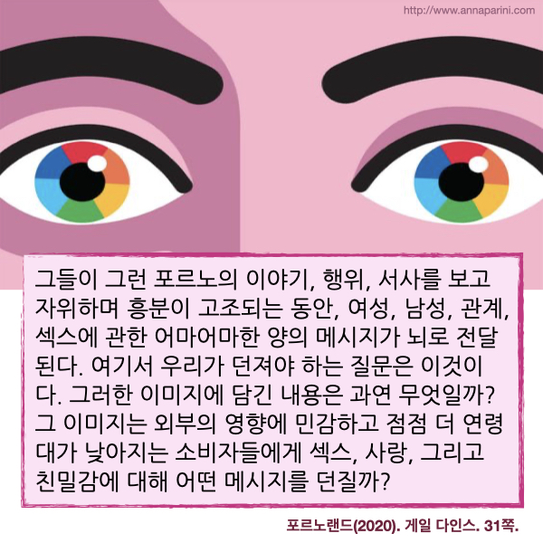 교육에 관한 우아한 구절들로 가득찬 내 sns에, 나는 이 구역질나는 현실을 드러낸 '포르노랜드'의 구절을 몇 개나 실을 용기가 있을까. 이 책의 구절을 몇 개 게시한다면, 뭐가 바뀌기는 할까. 너무도 거대한 포르노산업 앞에, 그리고 포르노에게 자신의 섹슈얼리티를 빼앗겨버린 남성들이 내 옆에 앞에 뒤에 널려있다는 것을 알게 된 이 시점에, 의아한 것들이 너무도 많아진다.