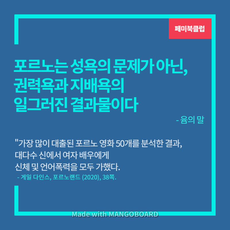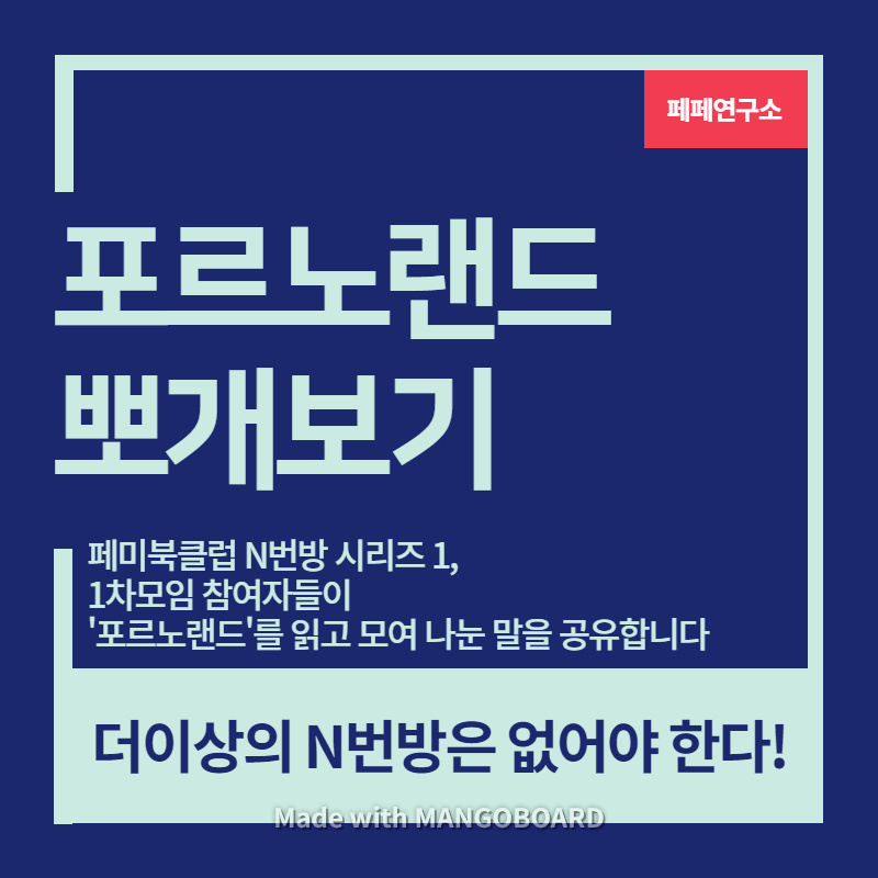 소위 N번방 화력이 약해졌다며 다시 해시태그를 달자는 운동도 sns에서 있는 것 같습니다. 포르노 시리즈 책읽기와 이 카드뉴스는 분노의 불꽃을 꺼뜨리지 않고 그 불꽃의 힘으로 주변을, 사회를 변화시키기 위한 페페연구소의 노력입니다. 이 뉴스를 읽는 분들 각자가 우리 주변에 널려있는 포르노, 포르노의 이미지, 포르노 문화 등에 대해 생각해볼 수 있다면 좋겠습니다.