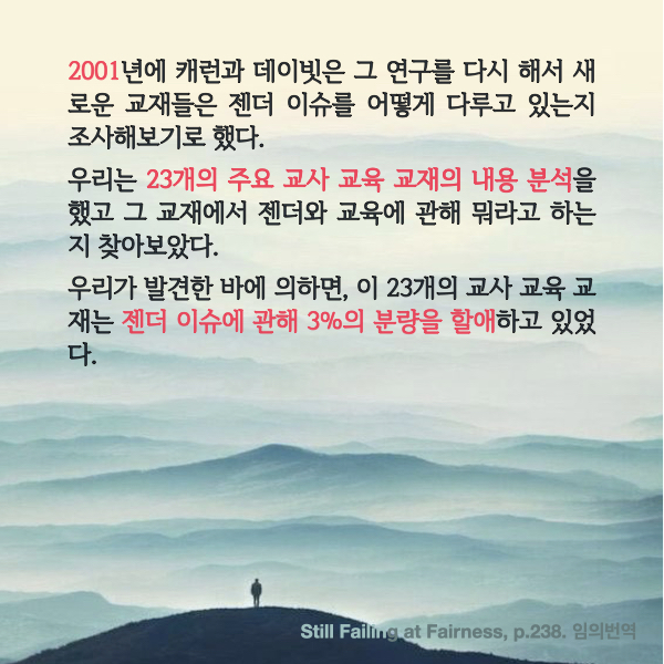 2001년 같은 연구를 했을 때, 23개 교재가 3%의 분량을 할애하여 젠더 이슈를 다루고 있었다.