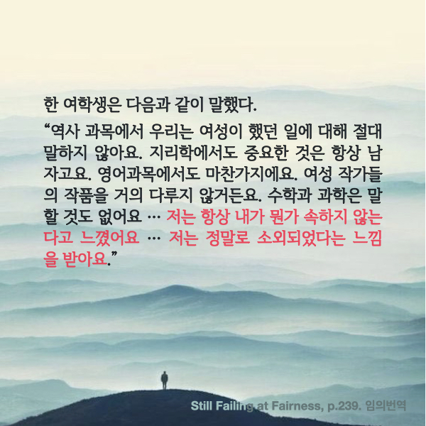 그리고 그 과정에서 어떤 여학생은 항상 뭔가 소속되어 있지 않다는 느낌, 항상 소외감을 느끼고 있다고 말한다. 이렇게라도 인식하고 표현을 할 줄 안다면 그래도 낫다. 대다수는 인식조차 하지 못한 채, 이등시민으로서의 여성의 자리를 온 몸과 마음으로 받아들이게 된다.
