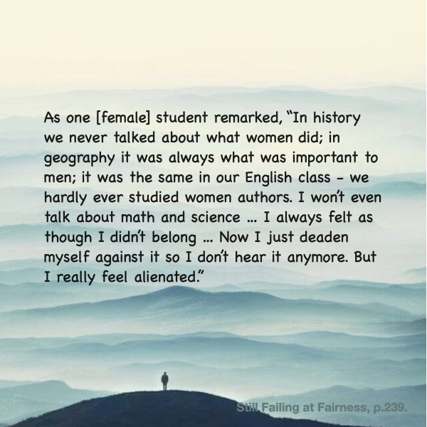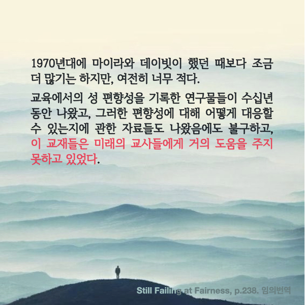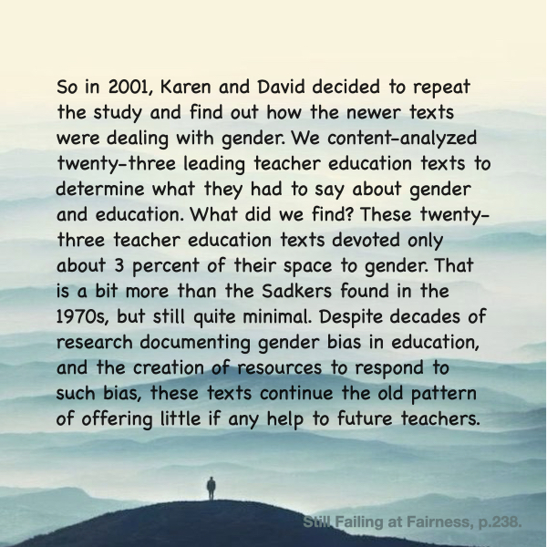 1970년대 후반 미국의 교사 교육 교재 24개를 분석했을 때, 23개 교재가 젠더 이슈를 1% 미만으로 다루고 있었다.