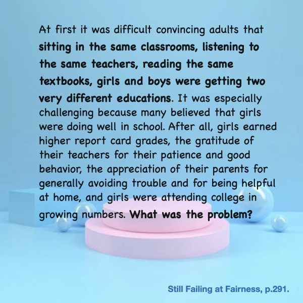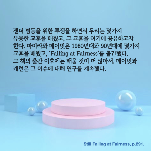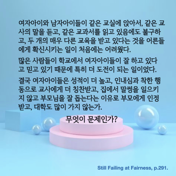 이 책 한 권에서 주욱 풀어서 설명한 문제들을 다시 한 번 짚어주고 대안을 제시하는 제일 마지막 챕터다. 우리도 지금 알파걸 담론이 존재하고 있고, 여자아이들 여학생들이 더 잘 나가는 것 같고 역차별 어쩌구 하는데, 도대체 뭐가 문제인가. 이 책을 읽어야만 알 수 있는 것들을 어떻게 대중에게 다리를 놓을까가 고민이 된다. 도대체 뭐가 문제인지는 다음 슬라이드에.