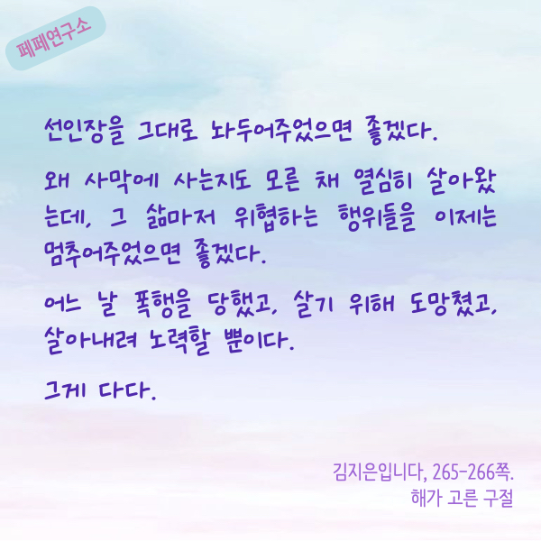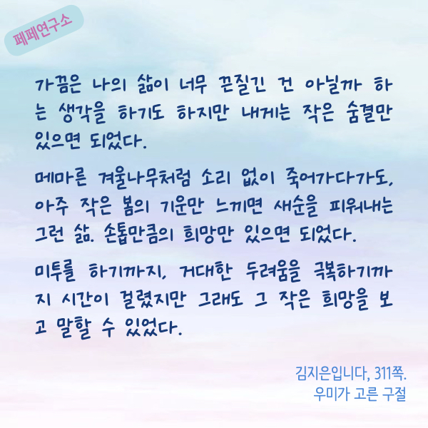 참여자들이 고른 책 속의 구절들입니다. 이렇게 지금 내 자리에서 내가 할 수 있는 방식으로 연대하는 여성들의 모습에서 희망을 봅니다.