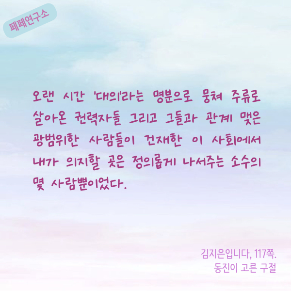 안희정 모친상을 계기로 가해진 대통령 스케일의 거국적인 2차가해에 대항하여, 김지은씨와 연대하는 여성들이 이미 '김지은입니다' 책을 구입해서 읽기 시작했습니다. '김지은입니다'는 베스트셀러 1위에 올랐습니다. 페페연구소에서도 (사실은 열받아서) 온라인 독서 모임을 열었습니다. 본래 이 책은 페미북클럽 N번방 시리즈에서 11월에 읽을 책으로 선정해놓았지만, 그 때까지 기다릴 수 없어서 오늘 온라인으로 모임을 했습니다. 소수 인원이라 1시간으로도 충분할 줄 알았는데, 예정된 시간을 훌쩍 넘겨 진행된 책모임에서 여러 이야기를 나누었습니다. 그 자체만으로도 숨통트이는 위로의 시간이었습니다. 시간 내어 참여해주신 분들께 감사드립니다.