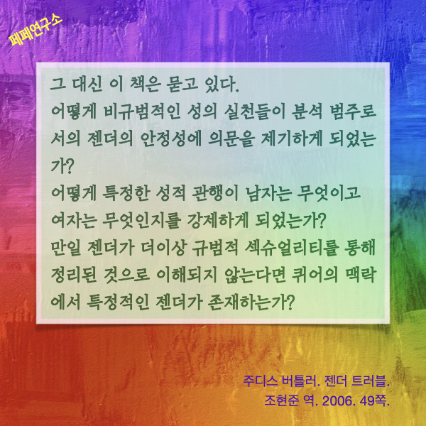 주디스 버틀러의 젠더에 관한 설명은 이성애자든 동성애자든 어떤 성적 실천을 하고 있는 자이게든 다 적용가능하고 그 삶을 설명해주는 부분이 있다. 그러기에 이 어려운 책이 전세계적인 베스트셀러가 되었을 것이다.
