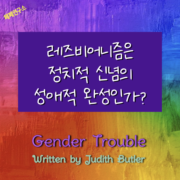 레즈비어니즘은 정치적 신념의 성애적 완성인가. 쥬디스 버틀러는 sex와 gender란 그것보다 훨씬 복잡한 문제라고 말하고 있다. 중요한 것은 뒤에 나오는 질문일 것이다. 젠더란 무엇인지에 대해, 젠더가 실천되고 강제되는 맥락은 무엇인지에 대해 깊이있게 생각해보는 것.