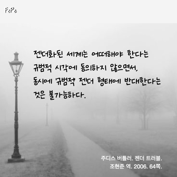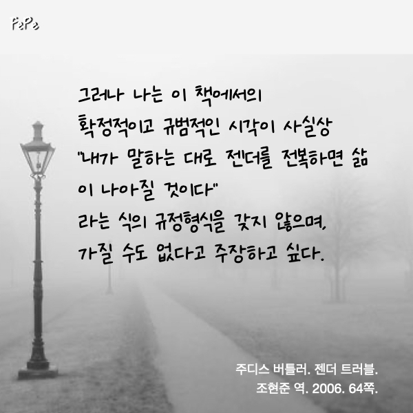 정말로 그렇다. 우리가 어떤 특정한 젠더를 어떻게 살아내야 할지를 누가 어떻게 판단하고 규정할 수 있다는 말인가. '젠더 트러블'이란 제목의 이 책에서 젠더를 샅샅이 파헤치며 뒤집는 일을 한다 해서, 주디스 버틀러가 어떤 특정한 형태의 젠더로 살아야 한다고 규정하는 것은 아니다. 이 점을 서문에서 분명히 하고 있다.