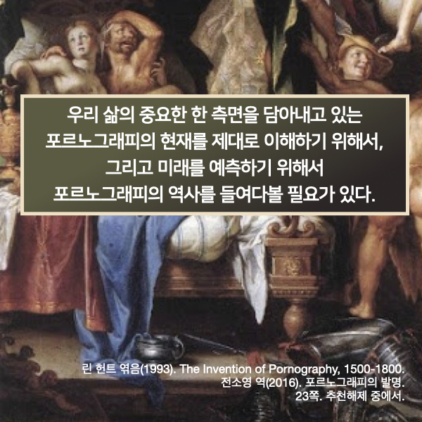 무슨 이슈든지, 역사를 공부하는 것은 의미가 있다. 과거가 현재에 어떻게 영향을 주었는지, 그리고 미래는 어떻게 되어갈지 희미하나마 그림을 그려볼 수 있을 것이다. '포르노그래피의 발명'은 1500년대에서 1800년대의 포르노그래피를 연구한 논문 9편을 실은 책이다. 이번 달 페미북클럽 모임에서는 좀 더 희망적인 얘기를 나눌 수 있게 되길 기대하며.