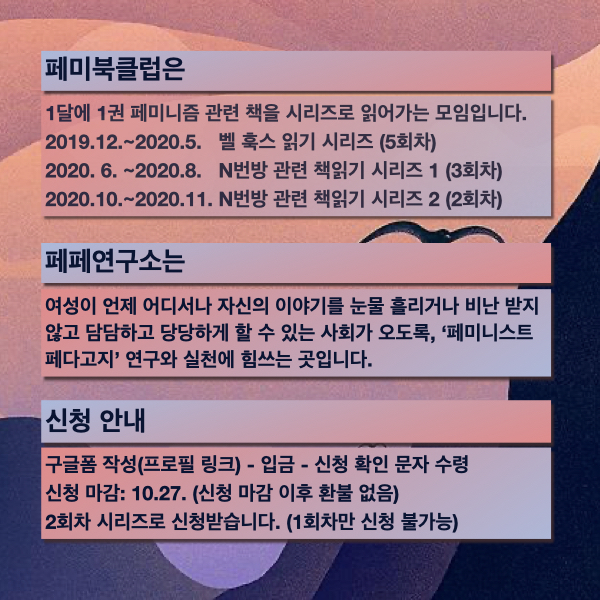 1달에 1권 페미니즘 책을 읽어가는 '페미북클럽'의 N번방 관련 책읽기 시리즈, 10-11월 모임(2회차) 신청서입니다. 10.29.(목) , 11.19.(목) 저녁 7:30-9:30 줌(zoom)을 통한 "온라인" 모임입니다. 링크는 신청
