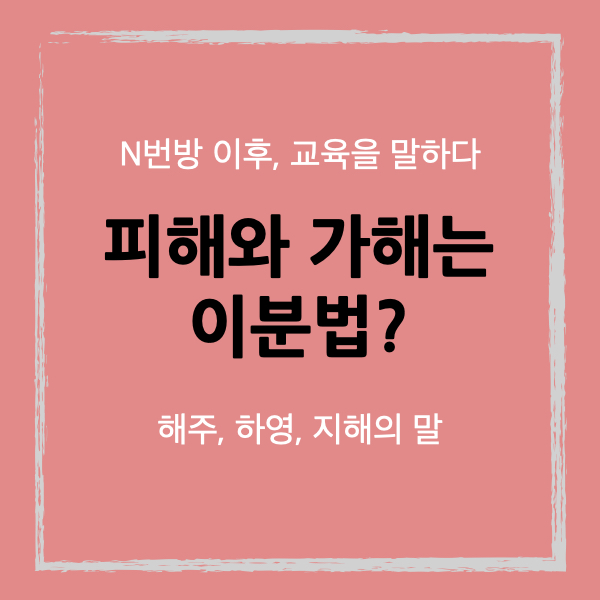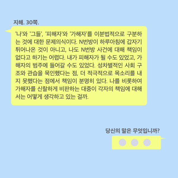 물론 N번방 사건에서는 분명히 피해자와 가해자가 존재한다. 그러기에 온 국민이, 특히 일부 혹은 대다수의 남성들이, 가해자를 악마화하고 정신병자 취급을 하면서 자기 자신과 아무 상관없는 일인 양 선긋기가 가능했을 것이다. 그러나 이 일이 정말로 나 자신과 아무 상관이 없을까. 피해와 가해는 어디에서부터 시작되며 피해와 가해, 혹은 피해와 피해 아닌 것을 명확히 나눌 수 있는 고정불변의 기준이란 무엇인가. 내가 직접 N번방에 입장하지 않았다고 해서 나 자신에게는 아무 잘못이 없는가. 어린 아이들부터 여성을 성적 대상화하는 성차별적 문화를 보고 들으며 온몸으로 배워가는 이 사회를 당연하게 여기고 살아온 나 자신에게는 아무 잘못이 없는가. 저자들은 바로 여기에 대해 질문을 던진다.