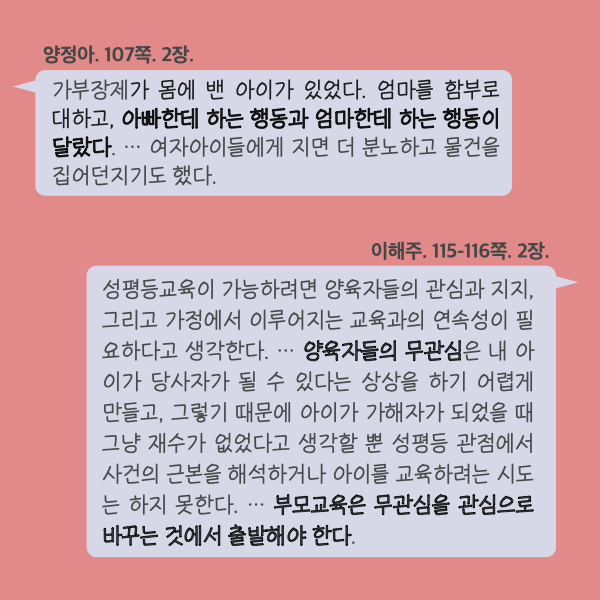 양정아 저자는 유치원 선생님이다. 그런데 심지어 유아기의 아이에게서도 가부장제가 몸에 배어, 엄마를 함부로 대하고 여자아이들을 무시하는 유아를 만난 적이 있다고 했다. 충격적이었다. 그런 아이가 크면 엄마에게 폭력을 행사하는 아들이 되는구나 싶었고, 그런 일이 정말로 어린 나이부터 시작되는구나 싶었다.