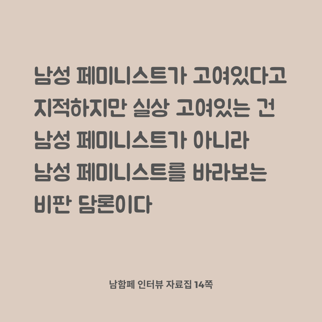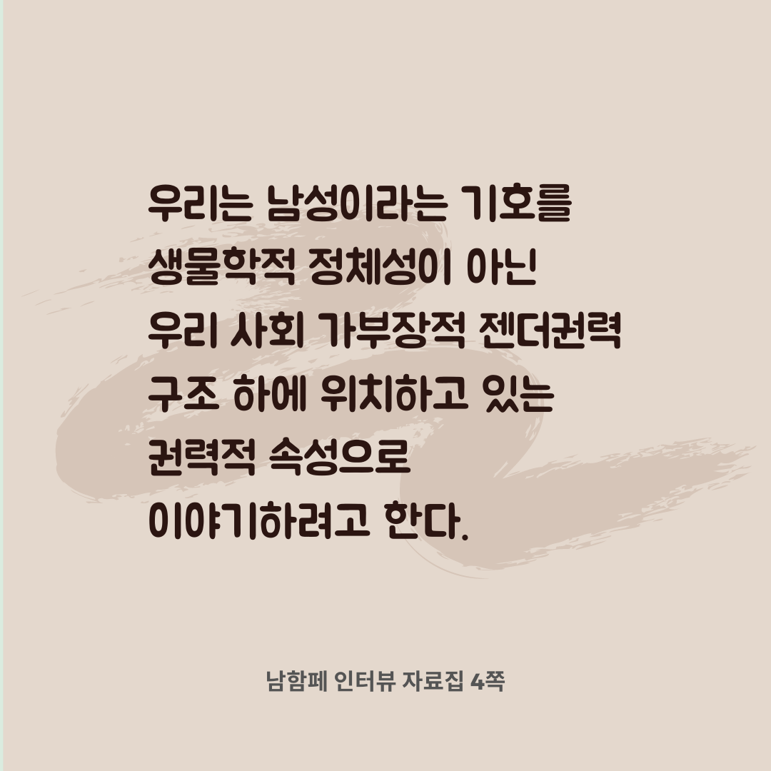 <N번방 이후, 교육을 말하다> 책의 저자로 8장에 참여해주신 '남성과 함께하는 페미니즘'(남함페) 대표 이한님이 공유하신 '2020 남함페 인터뷰 자료집: 남성 페미니스트를 발견하고 이야기하고 연결하다'에 나오는 내용입니다. 혹시 책 속의 뒷 이야기가 더 궁금하신 분들, 남성 페미가 가능할까 의문이신 분들, 4회차 북토크를 기다리시는 분들을 위해 공유합니다. 이 자료집을 읽으며 저 역시도, '남성 페미'라고 할 때의 '남성'을 '이성애자 시스젠더 남성'으로 은연중에 한정하고 있었음을 깨닫게 되었습니다. 그런 의미에서 남함페에서 사용하고 있는 '남성'이라는 '기호'가 '생물학적 정체성'에 기반한 남성이라는 분류가 아니라, 가부장제의 젠더권력 구조 속에서 발현되는 권력적 속성임을 의미한다는 말이 와 닿았습니다. 4회차 토크에서 이한님을 비롯한 더 많은 남성페미들과, 또 여성남성 가리지 않고 함께 페미니즘을 향해 나아가는 모두와 이야기할 시간이 저도 기대됩니다.
