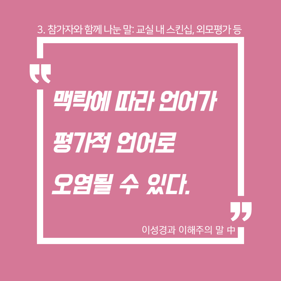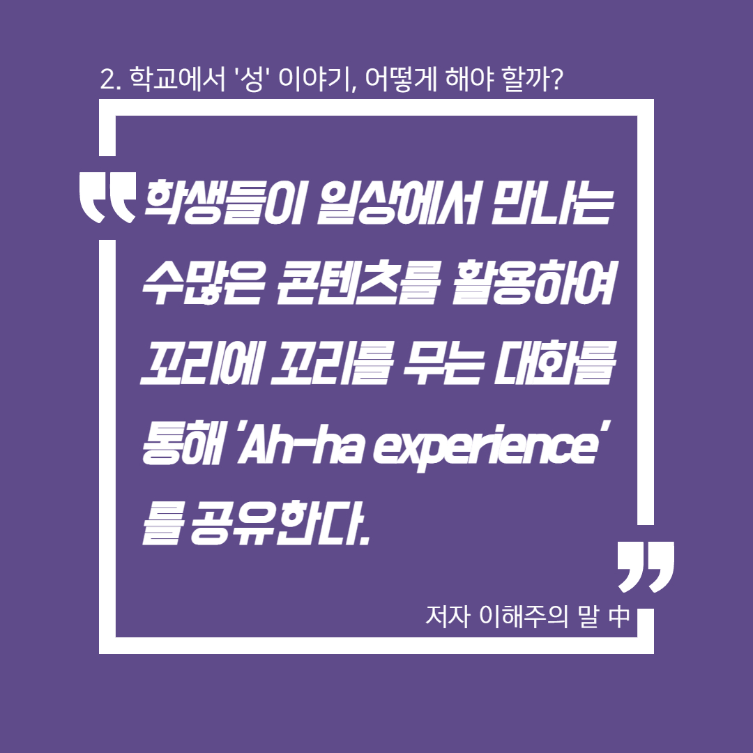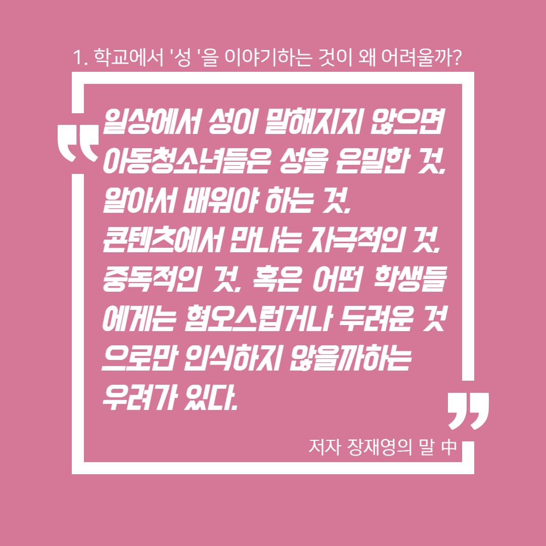 아동청소년의 문화는 비단 아동청소년들만의 문제가 아니다. 성인들의 문화를 보고 배우는 것이다. 학교에서 '성' 얘기가 꺼려진다면, 학교 밖 성인들의 세계에서는 과연 '성' 얘기가 어떤 방식으로 되거나 혹은 되지 않고 있는지도 함께 돌아보아야 한다. 언제까지 '성=야한 것'으로 치부하고 말하기를 금기시할 것인가. '야하다'는 말이 무슨 뜻인지 살펴보았는데, '천하게 아리땁다'(표준국어대사전), '성적인 호기심을 자극하는 힘이 있다'(고려대한국어대사전)는 뜻이 등장한다. 또한 놀랍게도 '야(冶)'자는 한자어였고, 6번째 뜻으로 '예쁘다, 요염하다'란 뜻이 있었다. 언어학자가 아니라서 더 이상 어원을 파고들지는 못하겠으나, 학교에서든 어디에서든 '성'이 감추어야만 하는 것으로 여겨지는 지금 사회에서, 도대체 '야한 것'이 무엇이길래 그러는지 묻고 싶다.