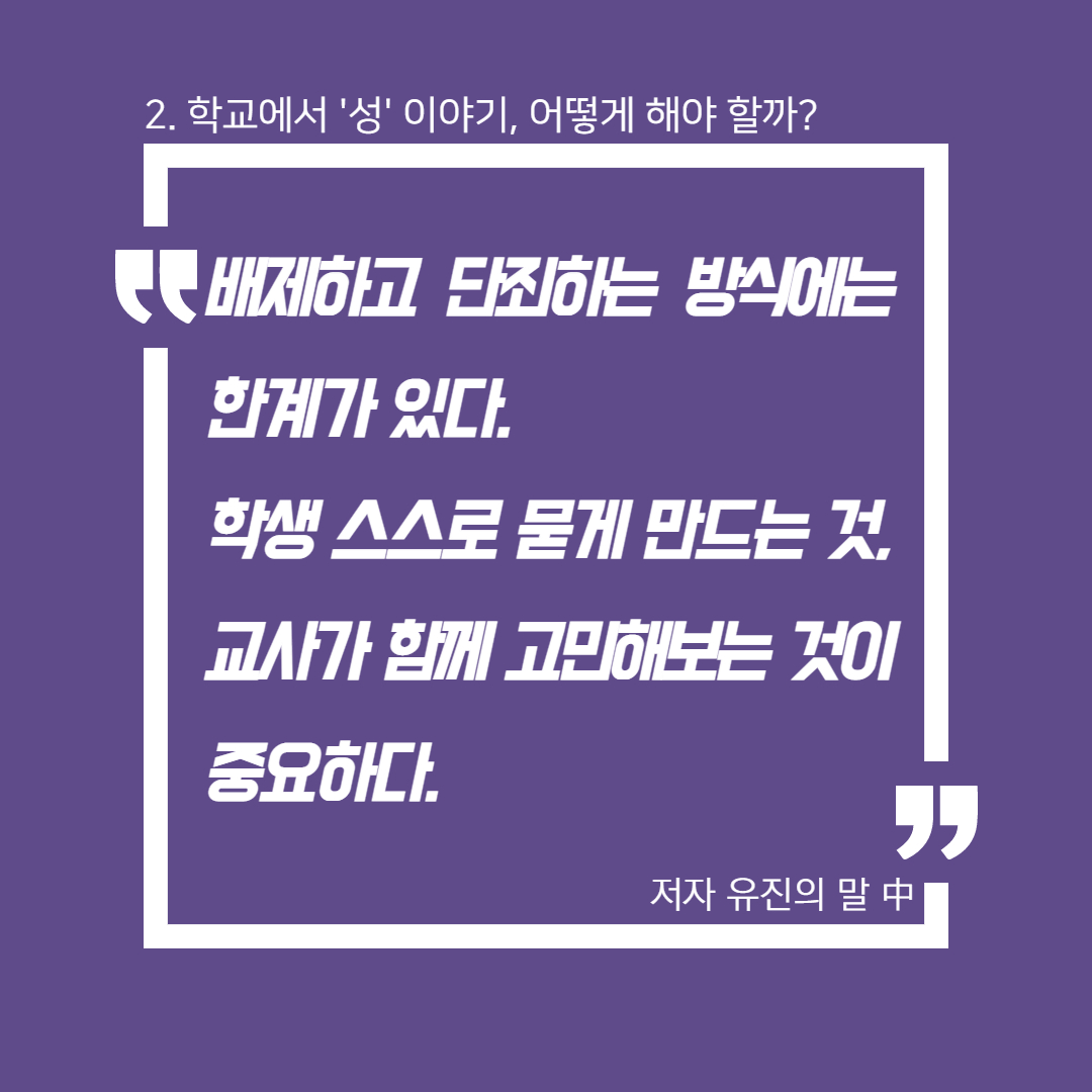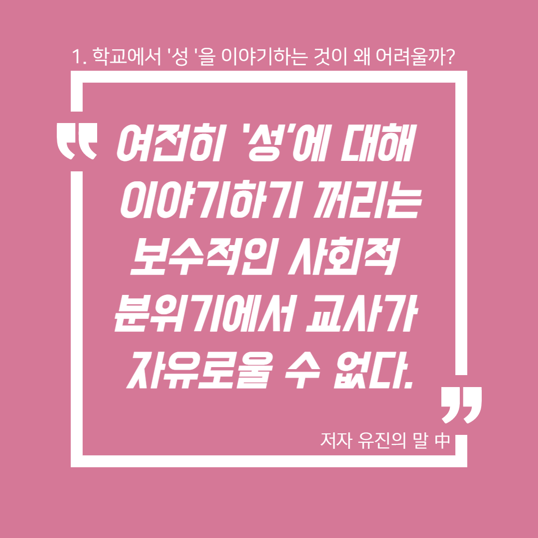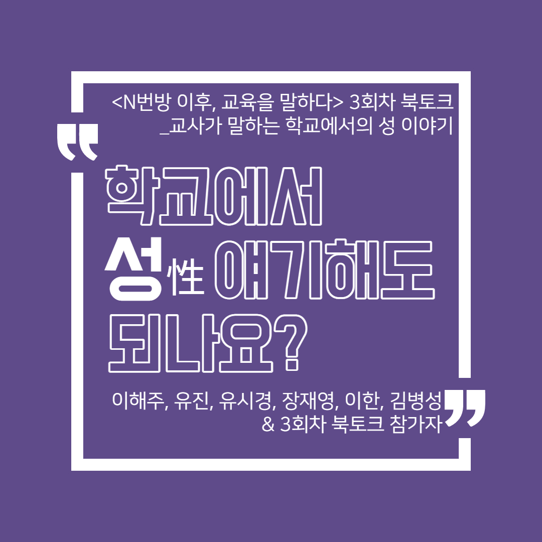 <N번방 이후, 교육을 말하다> 온라인 북토크 3회차, '학교에서 성 얘기해도 되나요?'의 토크 저자인 초중고등학교 교사들은 성을 금기시하고 통제하는 학교의 현실을 말한다. 그러나 중학교 교사 김병성은 학기 초에 늘 등장하는 '첫사랑 이야기' 등의 질문을 성찰하면서, 어쩌면 학생들이 선생님과 가장 말하고 싶은 것이 '성' 이야기가 아닐까 하는 성찰을 한다. 그렇다면 어떻게 성 이야기를 풀어나갈까. 교훈적인 이야기만 늘어놓아 학생들의 입을 막는 것이 아니라 대화가능한 상대가 되는 것, 완벽하게 모든 성 지식을 알 필요가 없으며, 함께 고민하고, 일상의 질문들을 던지며, 학생들 스스로 묻게 만드는 것이 변화의 시작이라고 저자들은 말한다. 이런 일들은 비단 학교에서만 행해져야 하는 일은 아니다. 온 사회에서, 모든 사람들이, '성'에 대해 이런 태도를 갖고 함께 말하기 시작한다면, '성'을 빌미로 여성을 협박하고 폭력을 행사하는 온갖 종류의 범죄들이 없어지는 날이 조금은 더 빨리 앞당겨 올 수 있을 것이다.