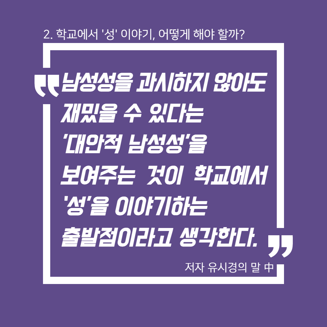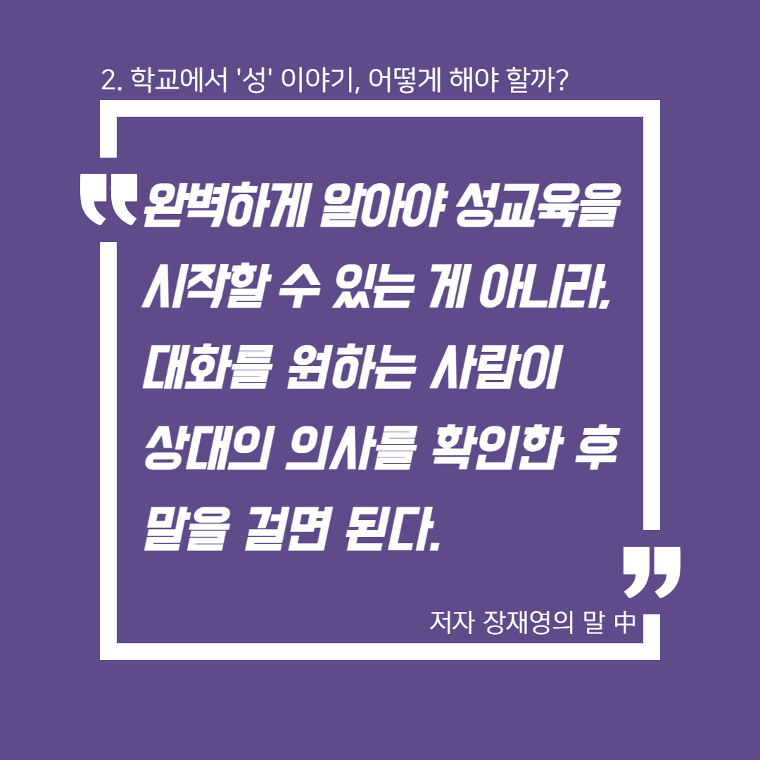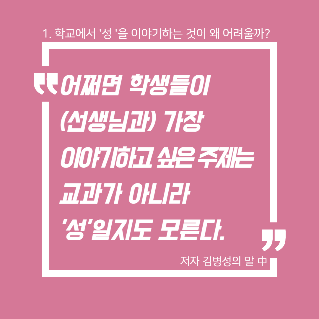 <N번방 이후, 교육을 말하다> 온라인 북토크 3회차, '학교에서 성 얘기해도 되나요?'의 토크 저자인 초중고등학교 교사들은 성을 금기시하고 통제하는 학교의 현실을 말한다. 그러나 중학교 교사 김병성은 학기 초에 늘 등장하는 '첫사랑 이야기' 등의 질문을 성찰하면서, 어쩌면 학생들이 선생님과 가장 말하고 싶은 것이 '성' 이야기가 아닐까 하는 성찰을 한다. 그렇다면 어떻게 성 이야기를 풀어나갈까. 교훈적인 이야기만 늘어놓아 학생들의 입을 막는 것이 아니라 대화가능한 상대가 되는 것, 완벽하게 모든 성 지식을 알 필요가 없으며, 함께 고민하고, 일상의 질문들을 던지며, 학생들 스스로 묻게 만드는 것이 변화의 시작이라고 저자들은 말한다. 이런 일들은 비단 학교에서만 행해져야 하는 일은 아니다. 온 사회에서, 모든 사람들이, '성'에 대해 이런 태도를 갖고 함께 말하기 시작한다면, '성'을 빌미로 여성을 협박하고 폭력을 행사하는 온갖 종류의 범죄들이 없어지는 날이 조금은 더 빨리 앞당겨 올 수 있을 것이다.