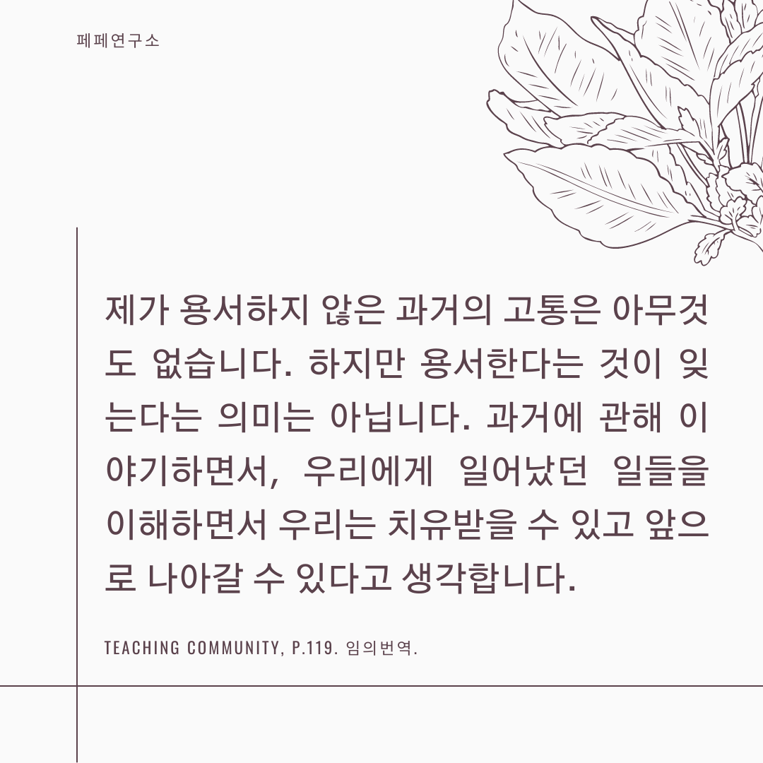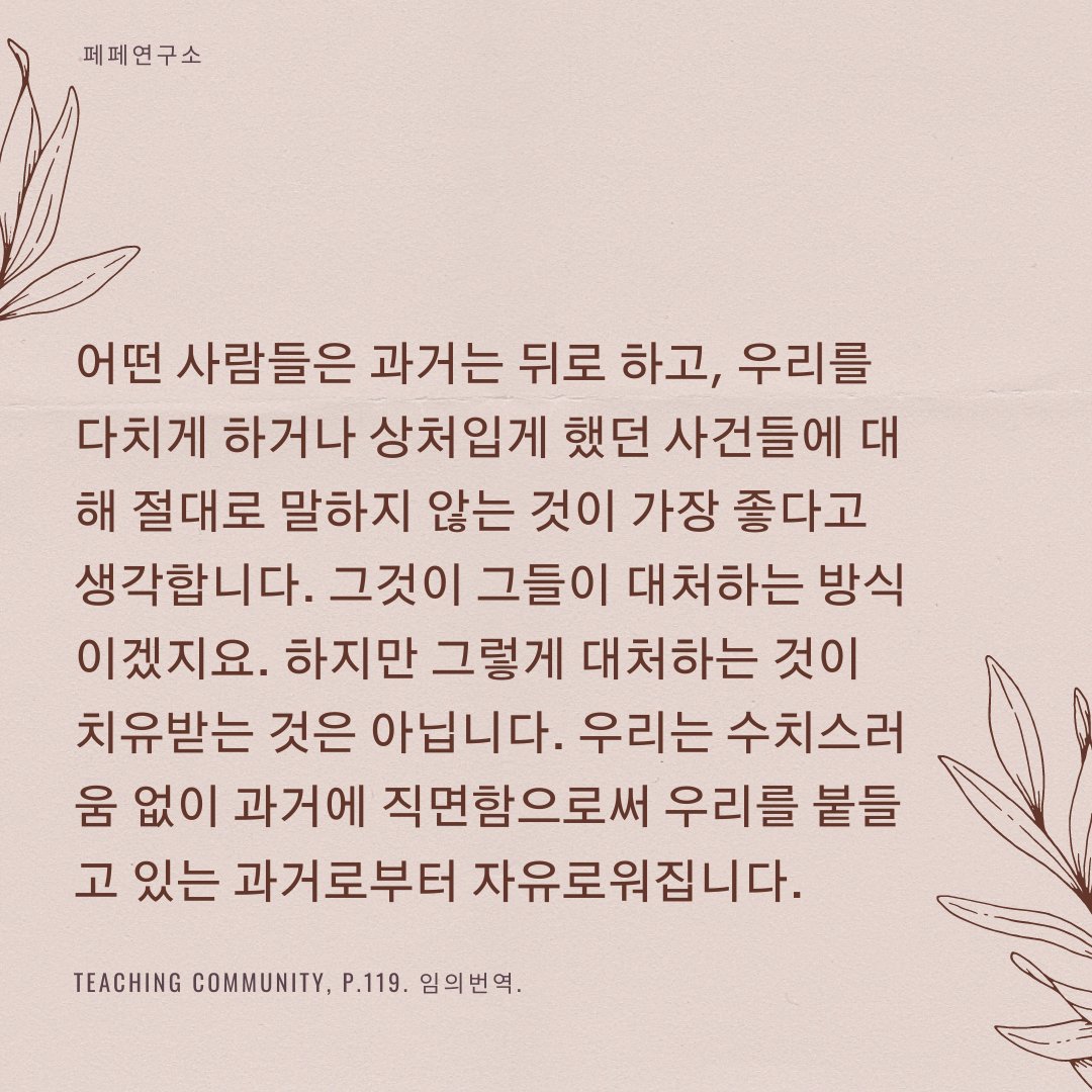 아마도 자신의 감정에 집중하거나 타인의 감정을 돌아보는 일을 하도록 훈련받은 적이 없는 대부분의 한국인들이 그러겠지만, 누군가에게 힘든 일이 있을 때 '잊어버려'라고들 흔히 말한다. '다 잊어버리고, 새출발 해'라고도 말한다. 벨 훅스가 이 글에서 콕 집어 꼬집는게 또한 그런 말들과 그런 말 뒤에 감추어져 있는 관점이다. 과거의 고통스런 일을 생각하지 않는 것이 현재에 그 일에 대처하는 한 방법이 될 수는 있겠지만, 그런다고 해서 치유받는 것은 아니라고 벨 훅스는 말한다. 하지만 우리가 용기를 내어 과거의 일들을 이야기하고, 그럼으로써 그 사건들을 이해하고, 수치심(shame) 없이 그 사건들에 직면할 수 있을 때, 그 때 우리는 치유받을 수 있고, 앞으로 나아갈 힘을 얻을 수 있다.