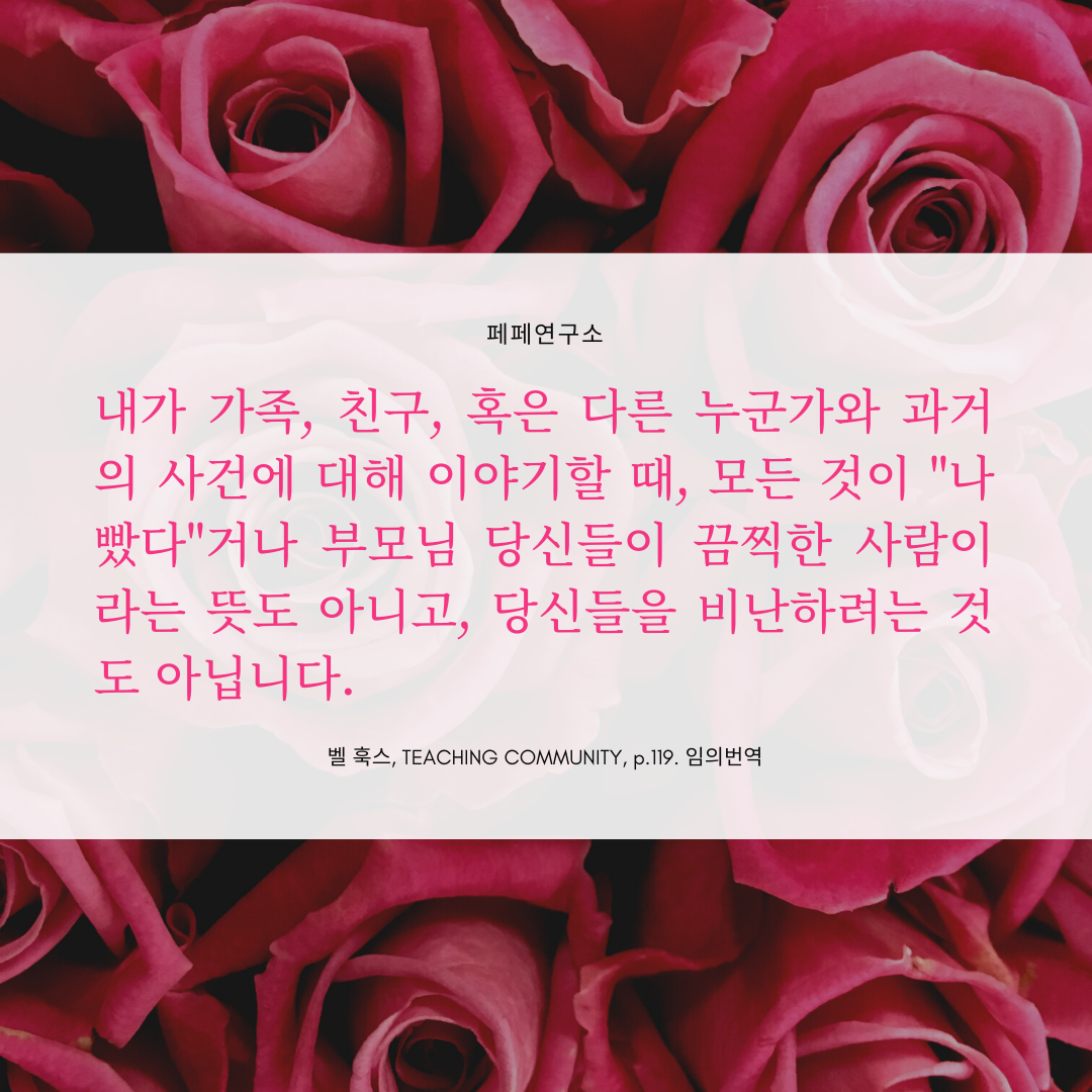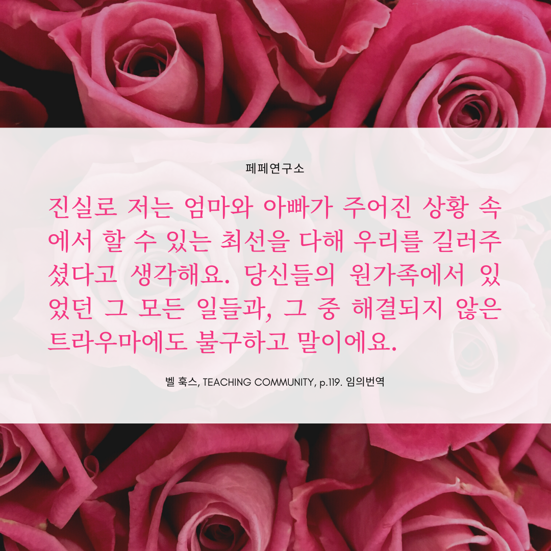 당신들이 할 수 있는 상황에서는 최선을 다해 나를 잘 길러준 것에 감사드립니다. 당신들 자신도 원가족에서의 아픔과 상처와 트라우마를 지닌 외로운 인간들로서, 그래도 애써서 저를 잘 길러준 것에 감사드립니다. 하지만 그 모든 폭력의 순간들, 언어적 폭력, 신체적 폭력, 혹은 정서적 방임, 정서적 학대, 그 모든 순간들을 잊었다는 의미는 아닙니다. 당신들이 부모로서의 할 일을 다 하지 않았던 그 모든 순간들에 대해 비판적으로 생각하고 있습니다. 인품좋은 벨 훅스처럼 모두 용서했다는 의미도 아닙니다. 다만 그 벨 훅스가 말한 것처럼, without shame, 수치스러워하지 않고 그 과거에 직면함으로써 스스로 치유받고, 앞으로 나아갈 힘을 얻고자 합니다. 당신들이 생존해 있었으면 아무리 강력 멘탈인 나로서도 하기 어려웠을 일, 아마도 그 동안 조금씩 하고 있었던지도 모르겠네요. 좋았던 기억이 없는 건 아닌데, 그런 기억에 대한 감사함과, 그렇지 않았던 그 모든 기억에 대한 비판하는 마음이 함께 있어도 된다고, 함께 있을 수 있다고, 나도 함께 가지고 살고 있다고 말하는 벨 훅스라는 페미니스트를 알게 되어서 다행이네요. [엄마 사망 10년, 아빠 사망 20년째인 2021년 가정의달에.]